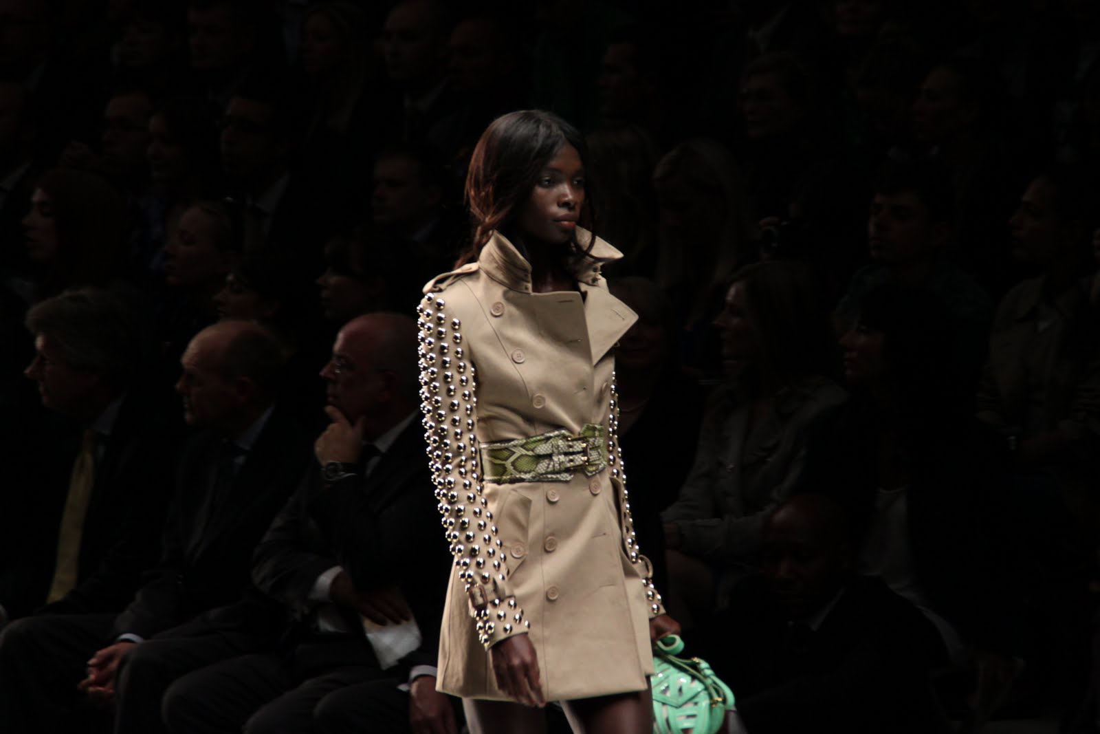 Color combinations were clever, one of my favorite colors,turquoise, was used in belts and bags together with lavender flavored trench coats. Shiny bright aquamarine colored bags and dresses were thrown together with brown and red. There was also a lot of silver colors and black leather jackets. Looks like the biker trend is still going on strong.